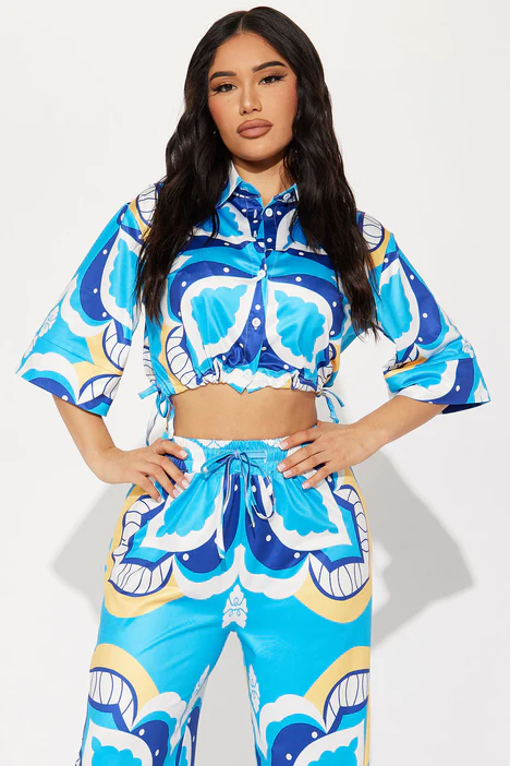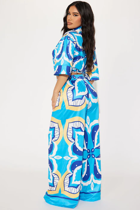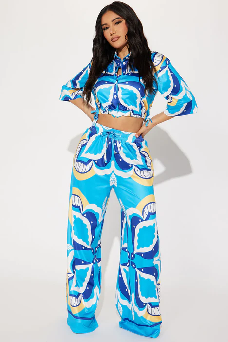 Available In Blue/comboPant Set; Collar; 3/4 Sleeve; Button Closure; Elastic Waist; Wide Leg; Waist Drawstring; Tie Front; Elastic Waistband …